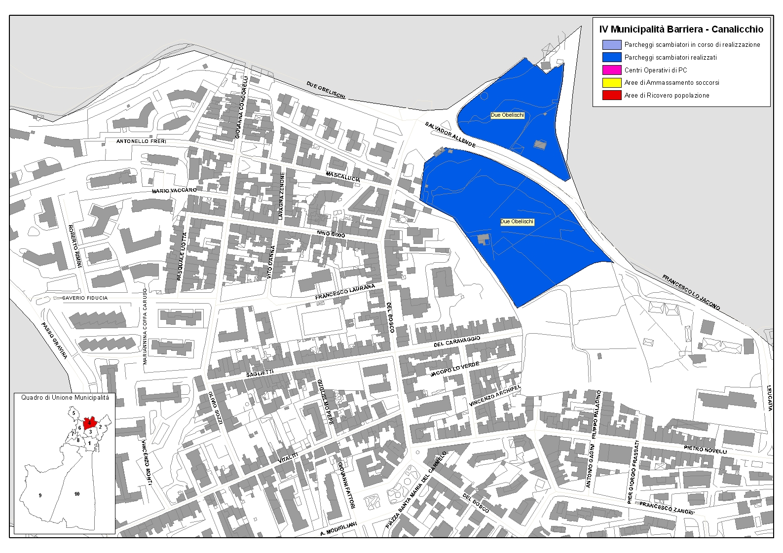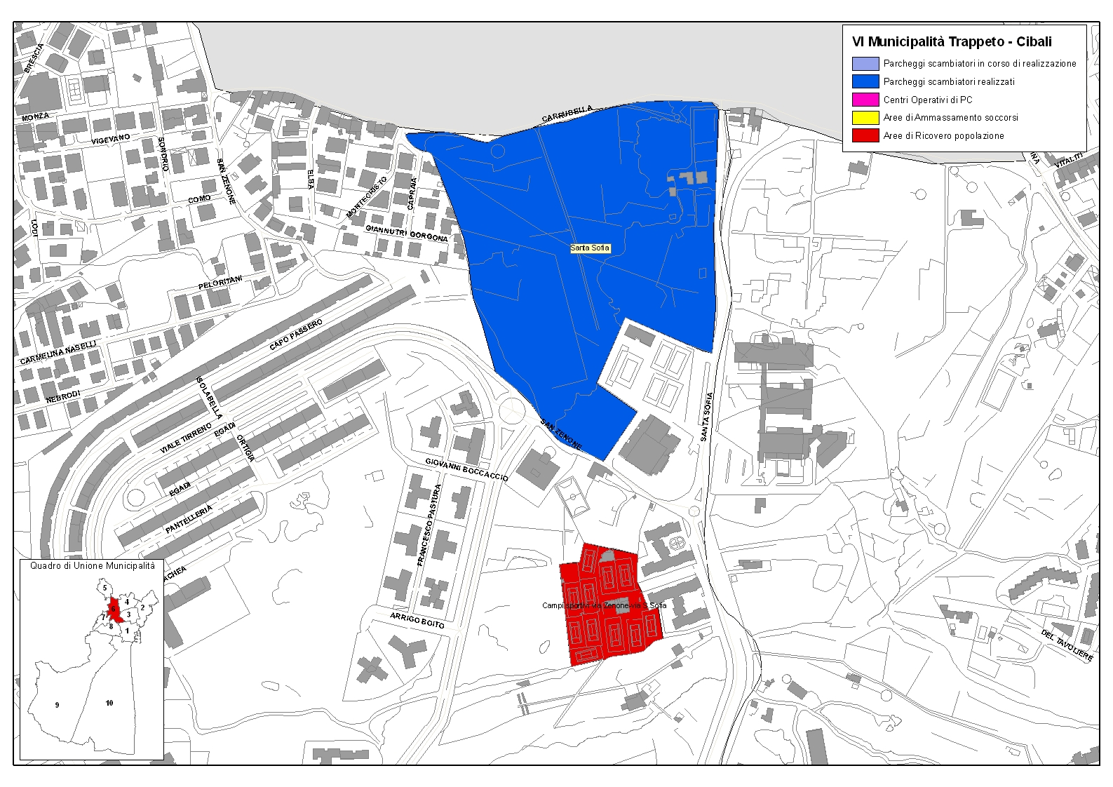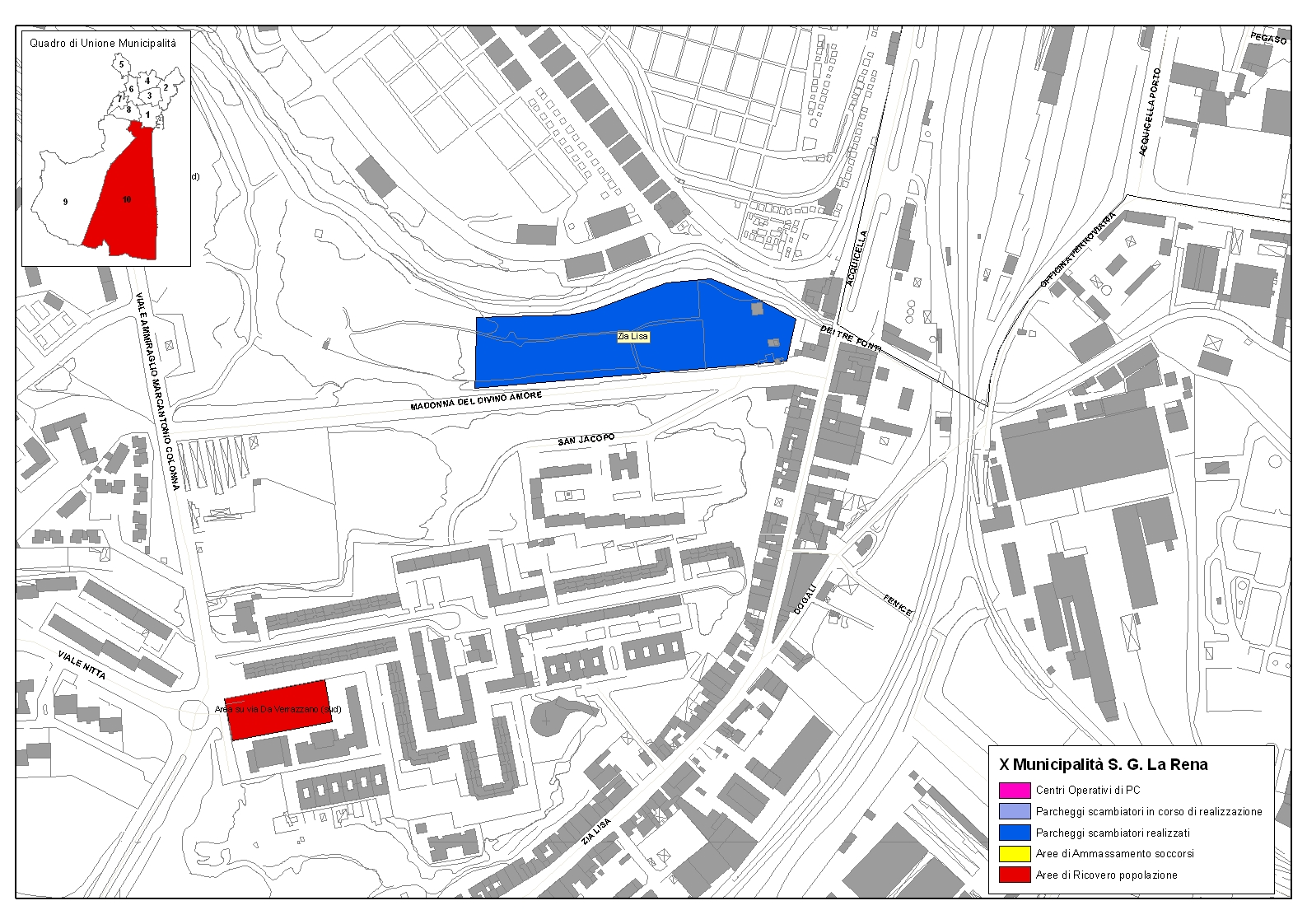 Qui di seguito vengono riportati i Parcheggi Scambiatori, già realizzati o in corso di realizzazione, dove poter disporre, in caso di emergenza, i moduli abitativi e/o le tende ministeriali nonché quanto occorre per la realizzazione di campi di assistenza e ricovero alla popolazione ovvero per l'accoglienza dei soccorritori. I parcheggi sono stati realizzati con i sottoservizi utili in caso di emergenza (acqua, luce e smaltimento fognario).