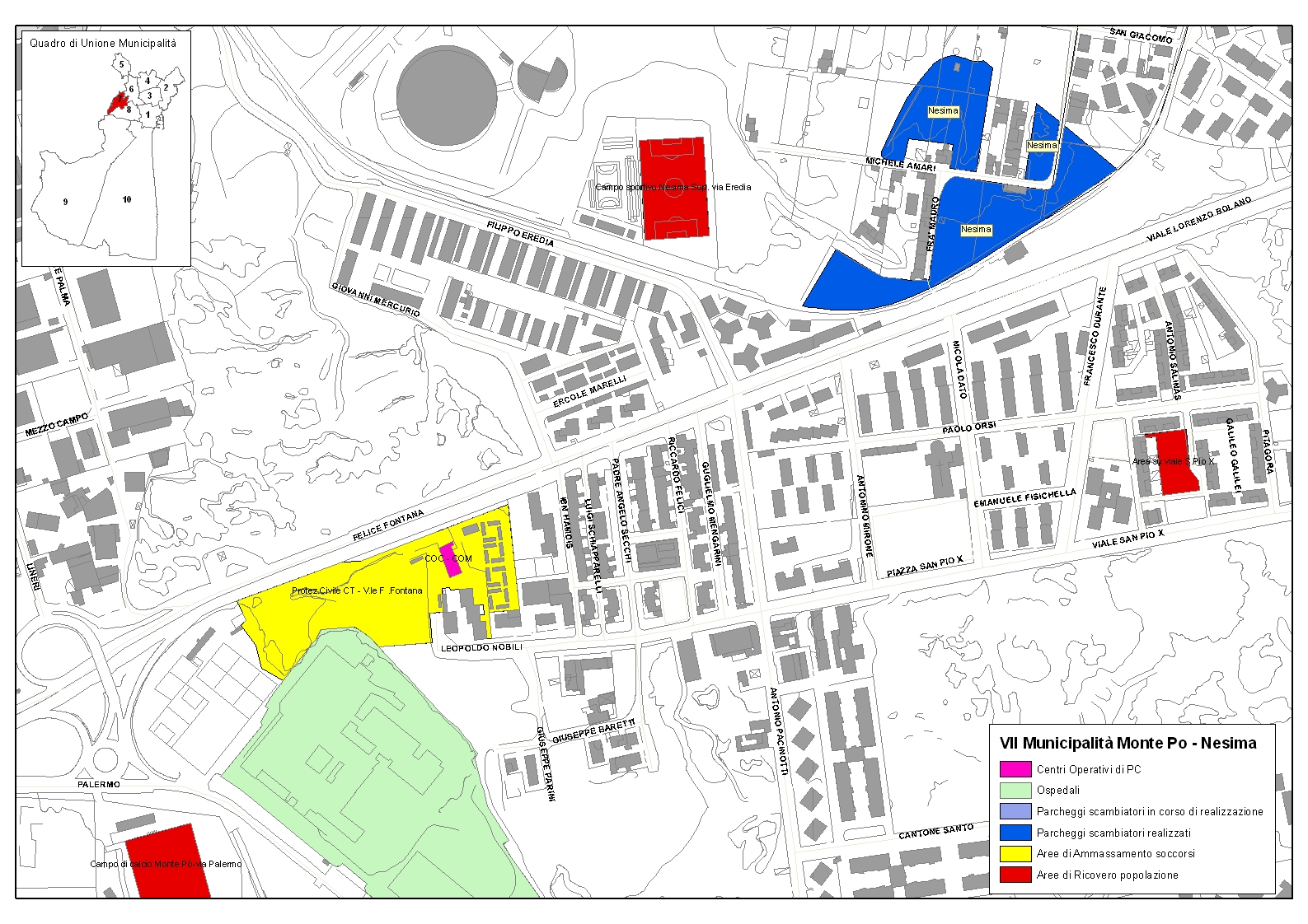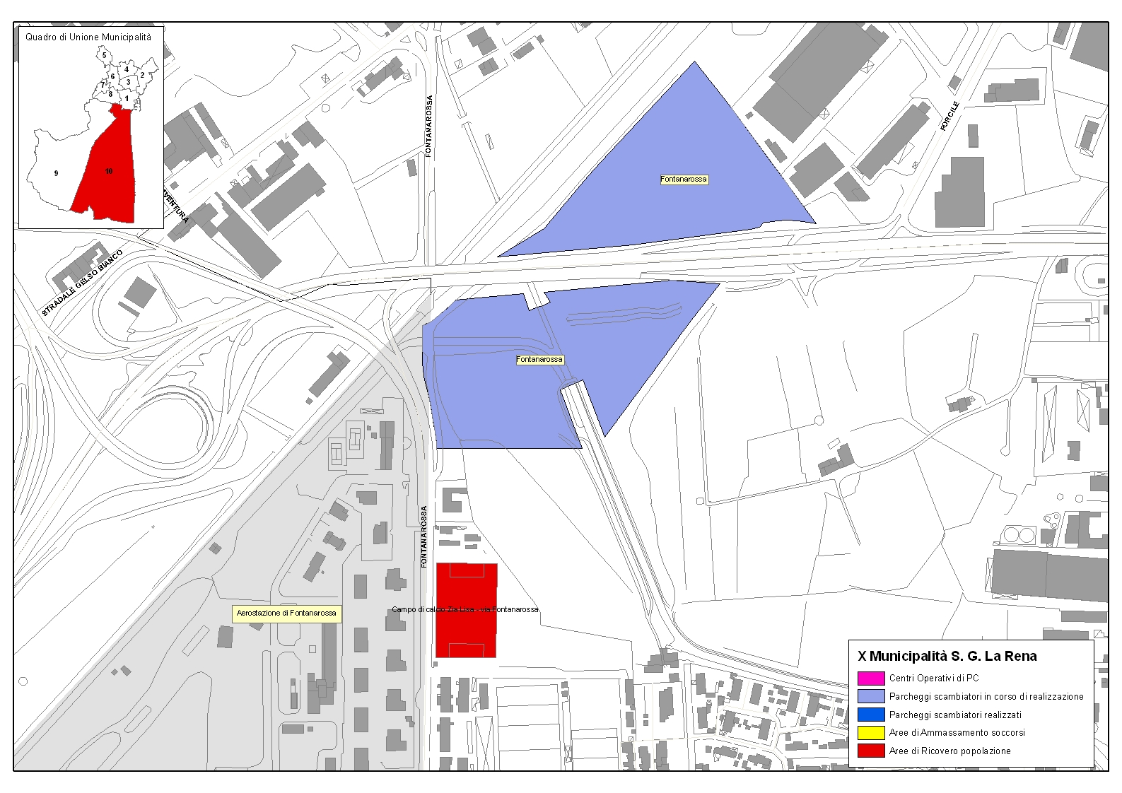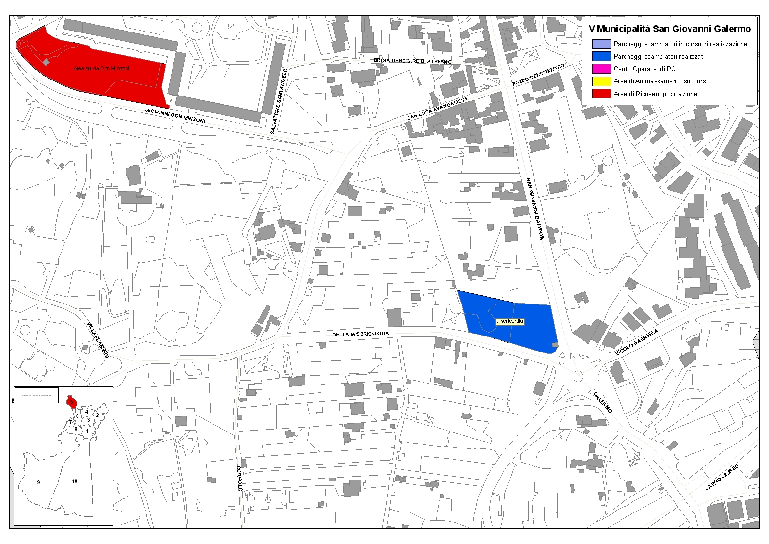 Qui di seguito vengono riportati i Parcheggi Scambiatori, già realizzati o in corso di realizzazione, dove poter disporre, in caso di emergenza, i moduli abitativi e/o le tende ministeriali nonché quanto occorre per la realizzazione di campi di assistenza e ricovero alla popolazione ovvero per l'accoglienza dei soccorritori. I parcheggi sono stati realizzati con i sottoservizi utili in caso di emergenza (acqua, luce e smaltimento fognario).