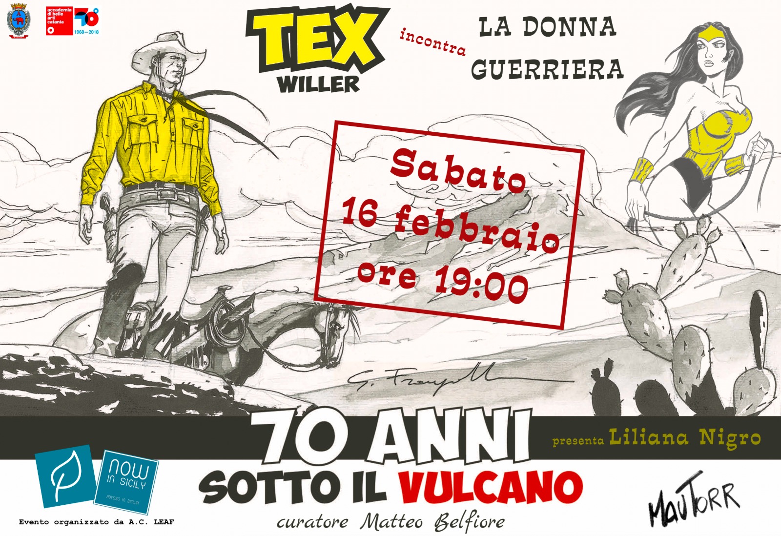 La mostra “Tex Willer, 70 anni sotto il vulcano”, voluta dal Sindaco Salvo Pogliese e dall’Assessore alla Cultura Barbara Mirabella, realizzata grazie alla collezione privata del curatore Matteo Belfiore, presenta oltre 40 opere tra disegni originali, stampe, tabelloni e quadri sinottici e sarà visitabile fino al 9 marzo alla GAM (via Castello Ursino, 26 – Catania).
