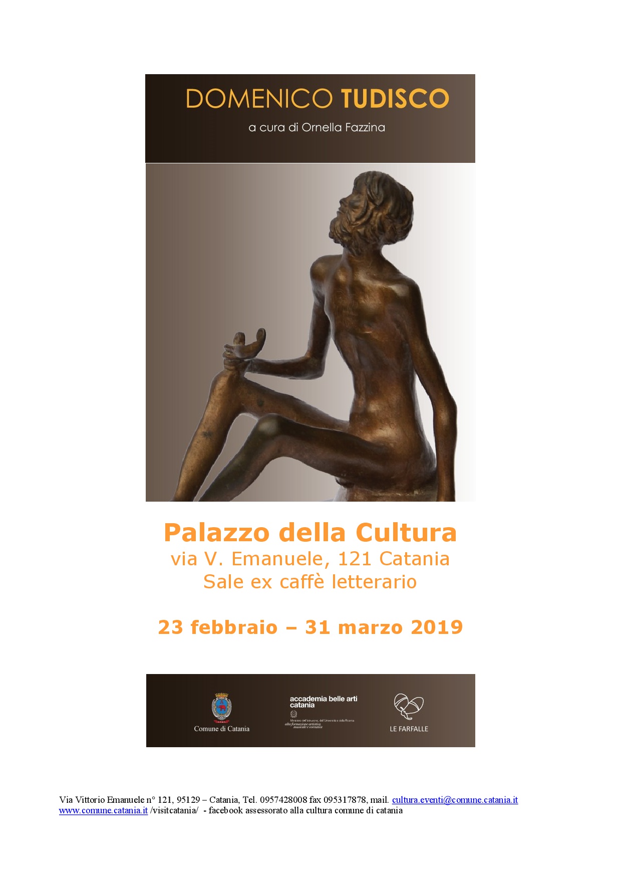 Giorno 23 febbraio alle ore 17,30 presso le sale espositive dell'ex caffè letterario del Palazzo della Cultura di Catania sarà inaugurata, alla presenza del Sindaco Salvo Pogliese, dell’Assessore Barbara Mirabella e del Direttore dell’Accademia di Belle Arti di Catania Enzo Tromba, la mostra Domenico Tudisco a cura di Ornella Fazzina.