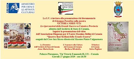 Palazzo Platamone 27 giugno ore 16,30 Presentazione del documentario della mostra "VICTORIA NOBIS VITA" Le ripercussioni della Grande Guerra su Catania e provincia