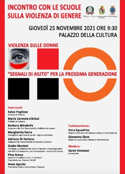Interverranno il sindaco Salvo Pogliese, il prefetto di Catania Maria Carmela Librizzi, l'assessore alle Pari Opportunità e alla Pubblica Istruzione, Barbara Mirabella, la consigliera regionale di Parità Margherita Ferro. Tra i relatori anche Adriana Di Stefano, delegata alle Pari Opportunità dell'Università di Catania, Guido Nicolosi, sociologo e presidente del corso di laurea in Sociologia delle reti dell'informazione e dell'innovazione dell'Università di Catania, Pina Arena, docente di Lettere istituto “G. B. Vaccarini” e presidente sezione di Catania Fnism (federazione nazionale insegnanti), Anna Agosta, presidente del Centro antiviolenza Thamaia. Sono previste le testimonianze di Vera Squadrito, mamma di Giordana Di Stefano vittima di femminicidio, e Giovanna Zizzo, mamma di Laura Zizzo vittima di femminicidio. Modererà l'incontro la giornalista Sarah Donzuso.
