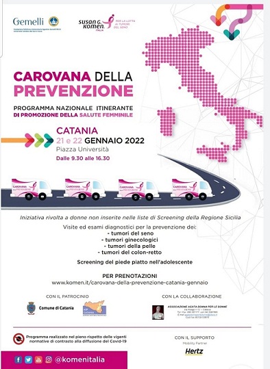 Venerdì 21 e sabato 22 gennaio piazza Università ospiterà la "Carovana Prevenzione Sicilia" del progetto Komen Italia che, con la collaborazione del Comune, dell'Asp e dell’Associazione "Agata Donna per le Donne", offrirà esami diagnostici gratuiti a donne in difficoltà socio-economica non rientranti per fascia di età negli screening regionali.