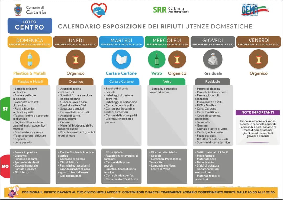 I kit con i mastelli per la raccolta differenziata possono essere ritirati gratuitamente dai residenti del lotto Centro, nell'isola ecologica di via Ala angolo via Cesare Beccaria e nel comunale di raccolta di via Gianni a Picanello, da lunedì a venerdì, dalle ore 8.30 alle ore 13.30.