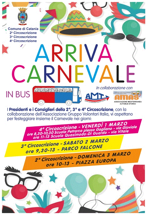 Il Consiglio della 2ª Circoscrizione, con la collaborazione dell'Associazione Gruppo Volontari Italia, via aspetta in Piazza Europa, giorno 3 marzo 2019, ore 10 - 13, per festeggiare il Carnevale.