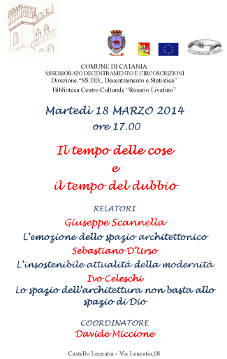 Martedì 18 Marzo 2014 alle ore 17.00, la Biblioteca C.C. "R. Livatino" , in collaborazione con l'associazione "L'Accademia del tempo", organizza la conferenza "Il tempo delle cose e il tempo del dubbio". LOCANDINA IN FORMATO PDF