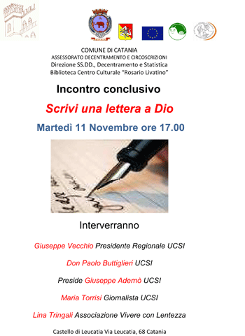 Martedì 11 novembre 2014, alle ore 17.00 nella Biblioteca Centro Culturale "R. Livatino" si terrà la manifestazione conclusiva di "SCRIVI UNA LETTERA A DIO", iniziativa promossa in collaborazione con l'Associazione Vivere con Lentezza e l' Unione cattolica stampa italiana(Ucsi) in cui saranno consegnati gli attestati ai partecipanti che hanno scritto le lettere.