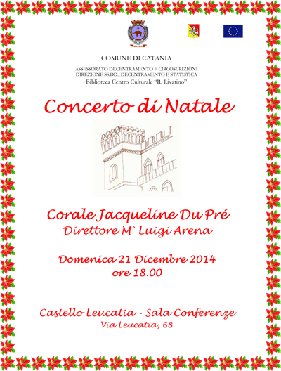 Domenica 21 Dicembre 2014, alle ore 18.00, presso la Sala Conferenze del Castello Leucatia . si terrà il Concerto di Natale del Coro Jacqueline du Prè , diretto dal M° Luigi Arena.