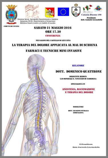 Relatore: dott. Domenico Quattrone, dirigente medico presso l'ospedale S. Vincenzo di Taormina e specialista in anestesia, rianimazione e terapia del dolore.