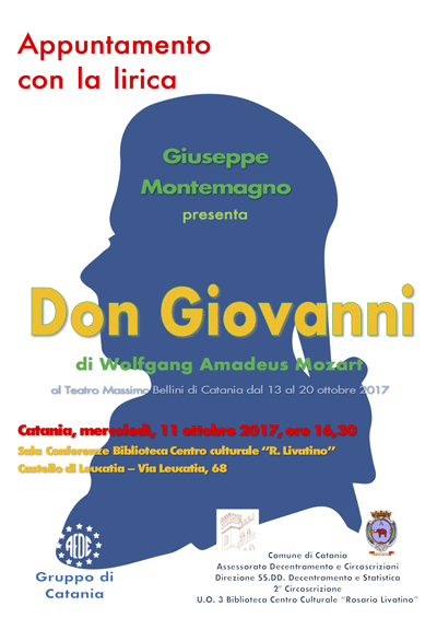 Il dott. Giuseppe Montemagno, musicologo e storico della musica, presenterà l'opera Don Giovanni di Wolfgang Amadeus Mozart, dramma giocoso su libretto di Lorenzo Da Ponte, che verrà rappresentata al Teatro Massimo Bellini dal 13 al 20 ottobre.