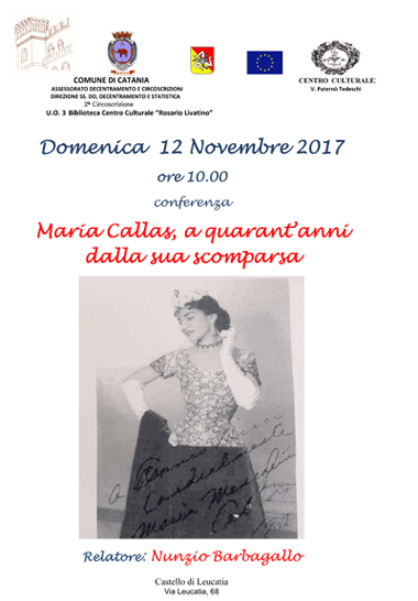 Domenica 12 Novembre 2017 alle ore 10.00, la Biblioteca Centro Culturale "R. Livatino", in collaborazione con il Centro Culturale "V. Paterno' Tedeschi", propone la conferenza Maria Callas, a quarant'anni dalla sua scomparsa.