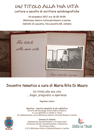 La Biblioteca Centro Culturale "R. Livatino" propone, martedì 14 novembre alle ore 16.30, in collaborazione con l'associazione di volontariato Le Stelle in Tasca, il secondo incontro di lettura e ascolto di scritture autobiografiche: