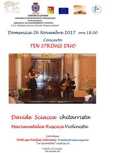Domenica 26 Novembre 2017 alle ore 18.00, la Biblioteca C.C. "R. Livatino" propone il Concerto Ten Strings Duo