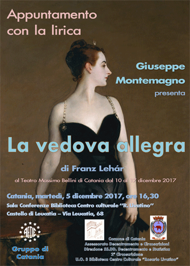 Il dott. Giuseppe Montemagno, musicologo e storico della musica, farà apprezzare ai presenti, attraverso l’ascolto di alcune arie e la visione di diapositive, l’opera di Franz Lehàr che verrà rappresentata al Teatro Massimo Bellini dal 10 al 17 Dicembre 2017.