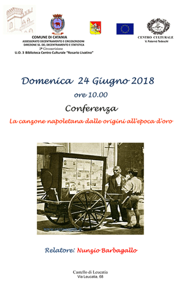 Domenica 24 giugno 2018 alle ore 10.00, la Biblioteca Centro Culturale “R. Livatino”, in collaborazione con il Centro Culturale “V. Paterno’ Tedeschi”, propone la conferenza La canzone napoletana dalle origini all'epoca d'oro.