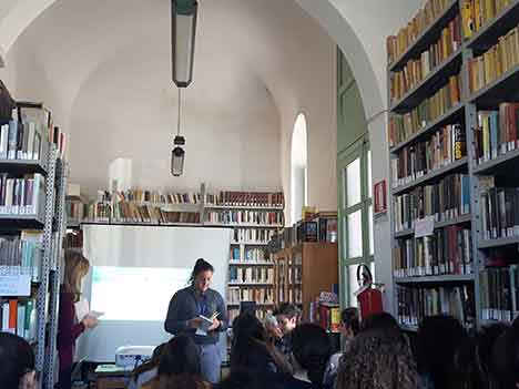 Parlare di poesia ai ragazzi, per Valeria Mazzeo, è stata un'esperienza entusiasmante. La giovane laureata in fisica, per la prima volta, ha potuto confrontarsi con un pubblico adolescente , che non avvezzo al genere letterario, ha scoperto, a sua volta, nelle parole di Valeria straordinari significati e momenti di riflessione sulla natura e sui sentimenti umani. In questa sinergia di voci e sensazioni nel contesto magico dei libri con la viva partecipazione di tutti i presenti, per la biblioteca Tondo Gioeni è stata un' occasione nuova e di sperimentazione della poesia nel contesto degli adolescenti di oggi.