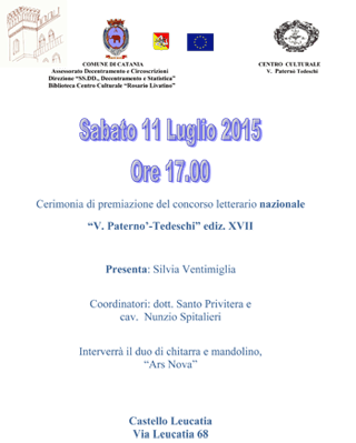 Sabato 11 Luglio alle ore 17.00 la Biblioteca C. C. "R. Livatino" , in collaborazione con il Centro Culturale "V. Paternò Tedeschi, propone la XVII edizione del Concorso letterario Nazionale "Vincenzo Paternò Tedeschi".