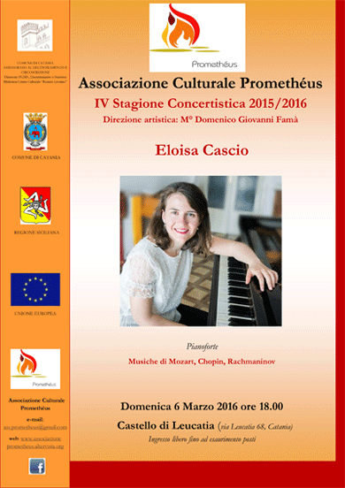 La Biblioteca C.C. "R. Livatino prosegue, in collaborazione con l'Associazione Culturale Promethéus, presso la Sala Conferenze del Castello Leucatia, via Leucatia 68, la IV Stagione Concertistica 2015/2016 - Direzione Artistica: M° Domenico Giovanni Famà