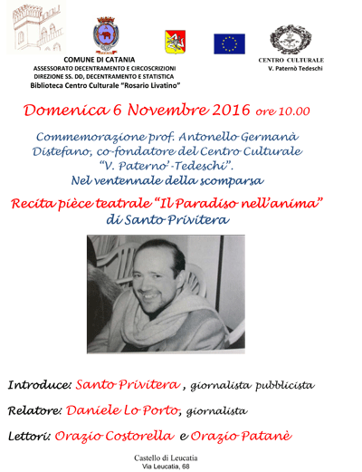 Domenica 6 Novembre 2016 alle ore 10.00, la Biblioteca Centro Culturale "R. Livatino" propone, in collaborazione con il Circolo Vincenzo Paternò Tedeschi, l'incontro dal titolo "La commemorazione del prof. Antonello Germanà Distefano, co-fondatore del centro culturale V. Paterno'-Tedeschi. Nel ventennale della Sua scomparsa".
