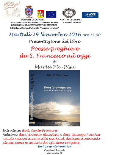 Martedì 29 novembre 2016 alle ore 17.00, la Biblioteca Centro Culturale "R. Livatino" propone, in collaborazione con il Circolo Vincenzo Paternò Tedeschi, la presentazione dell'antologia "Poesie-preghiere da San Francesco ad oggi" di Maria Pia Risa.
