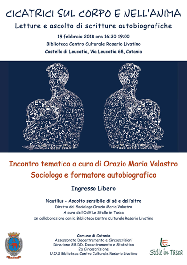 La Biblioteca Centro Culturale “R. Livatino” propone per Lunedì 19 febbraio ore 16.30 l' incontro di lettura e ascolto di scritture autobiografiche Cicatrici nel corpo e nell’anima, a cura di Orazio Maria Valastro, sociologo e formatore autobiografico.
