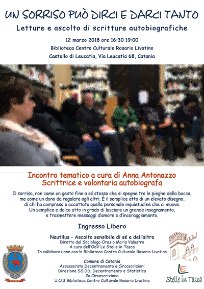 Le autrici e gli autori che desiderano proporre la lettura di un testo autobiografico, dovranno far pervenire le loro proposte per e-mail a info@lestelleintasca.org almeno una settimana prima la data dell'incontro preferito. Dato il numero limitato di letture per ogni incontro, le iscrizioni saranno accettate nell'ordine di arrivo. A cura dell'Organizzazione di volontariato Le Stelle in Tasca. Diretto dal Sociologo Orazio Maria Valastro