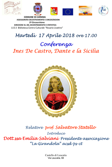 Martedì 17 aprile 2018 alle ore 17.00, la Biblioteca Centro Culturale “R. Livatino” propone la conferenza Ines De Castro, Dante e la Sicilia di Salvatore Statello.Il relatore, nell’ambito della conferenza, parlerà del suo libro «Ines de Castro. Un mito lungo cinque secoli»