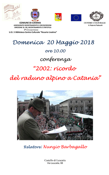 Domenica 20 Maggio 2018 alle ore 10.00, la Biblioteca Centro Culturale “R. Livatino”, in collaborazione con il Centro Culturale “V. Paterno’ Tedeschi”, propone la conferenza “2002: ricordo del raduno alpino a Catania”. Relatore:Nunzio Barbagallo.