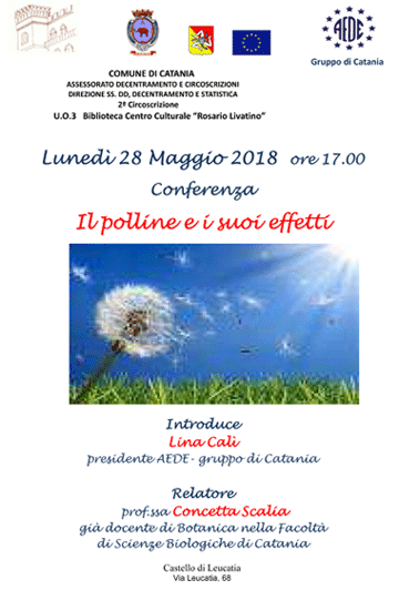 Lunedì 28 maggio 2018 alle ore 17.00, la Biblioteca Centro Culturale “R. Livatino” propone, in collaborazione con l’associazione AEDE di Catania, la conferenza “Il polline e i suoi effetti”.