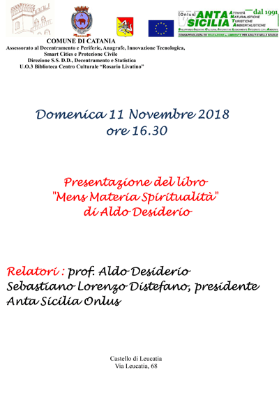 Domenica 11 novembre 2018 alle ore 16.30, la Biblioteca Centro Culturale “R. Livatino” propone la presentazione del libro “Mente Materia Spiritualità” di Aldo Desiderio.