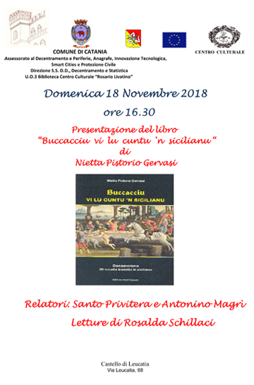 Domenica 18 Novembre 2018 alle ore 16.30, la Biblioteca Centro Culturale “R. Livatino” propone, in collaborazione con il Centro Culturale “V. Paternò Tedeschi”, la presentazione del libro “Buccacciu vi lu cuntu 'n sicilianu” di Nietta Pistorio Gervasi.