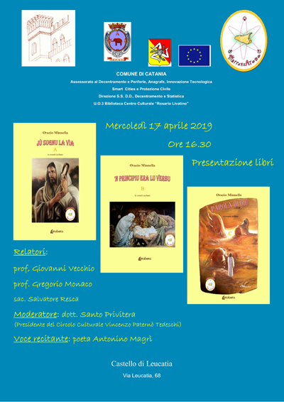 Mercoledì 17 aprile 2019 alle ore 16.30 la Biblioteca C.C. “R. Livatino” comunica la Mercoledì 17 aprile 2019 alle ore 16.30 la Biblioteca C.C. “R. Livatino” comunica la presentazione di una “Trilogia poetica” del sig. Orazio Minnella.