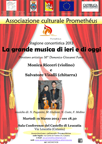 Martedì 19 Marzo 2013 alle ore 18.30, la Biblioteca C.C. "R. Livatino", in collaborazione con L'Associazione culturale Prometeus, propone il concerto del duo Monica Ricceri (violino) e Salvatore Visalli (chitarra).