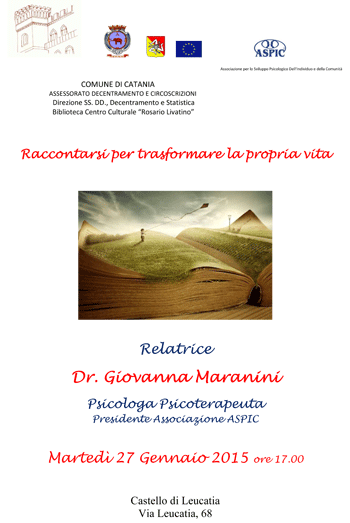 Martedì 27 Gennaio alle ore 17.00, la Biblioteca Centro Culturale "R. Livatino" propone, in collaborazione con l'ASPIC, Associazione per lo Sviluppo Psicologico dell'Individuo e della Comunità, la conferenza "Raccontarsi per trasformare la propria vita".