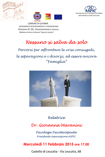 Mercoledì 11 Febbraio 2015 alle ore 17.00, la Biblioteca Centro Culturale "R. Livatino" propone, in collaborazione con l'ASPIC, Associazione per lo Sviluppo Psicologico dell'Individuo e della Comunità, la conferenza "Nessuno si salva da solo", percorsi per affrontare le crisi coniugali, le separazioni e i divorzi, ed essere ancora "Famiglia".