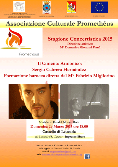 Domenica 29 Marzo 2015 alle ore 18.00, presso la Sala Conferenze del Castello Leucatia, si terrà il secondo Concerto della Stagione Concertistica 2015, in collaborazione con l'Associazione Prométeus, che vedrà esibirsi Il Cimento Armonico, formazione barocca diretta dal M° Fabrizio Migliorino con la voce del famoso tenore Sergio Cabrera Hernandez, specializzato nello studio ed esecuzione del repertorio operistico del XVIII secolo.
