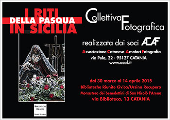 L’elenco dei riti della Pasqua è lunghissimo perché dovunque e tutti, uomini, donne e bambini partecipano il rituale della Morte e la celebrazione della Rinascita della vita, attenti nel preparare e nel curare ogni particolare della processione: dalla vestizione ai gesti, dal canto a u “lamentu”, dalla preghiera al silenzio; il fotografo testimonia gli sguardi, le emozioni, il “pathos” dei figuranti e dei fedeli, rivelando quel sincero e commosso senso di appartenenza della collettività e l’indissolubile legame tra le genti e la fede, tra la terra e le tradizioni.Biblioteche Riunite "Civica e A. Ursino Recupero" (Monastero dei Benedettini) Via Biblioteca, 13 95124 Catania Tel. (+39) 095 316 883 E-mail: biblct@virgilio.it Follow us on Blog: http://www.bibliotecacivicaursinorecupero.wordpress.com Find us on Facebook and Twitter