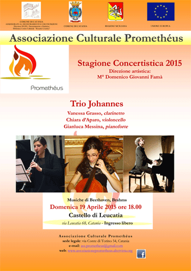 Domenica 19 Aprile alle ore 18.00, presso la Sala Conferenze del Castello Leucatia, si terrà l'ultimo Concerto della Stagione Concertistica 2015, in collaborazione con l'Associazione Prométeus, che vedrà esibirsi il Trio Johannes, Vanessa Grasso, clarinetto - Chiara d'Aparo, violoncello - Gianluca Messina, pianoforte.