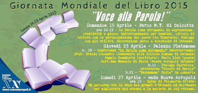 Domenica 19 Aprile 2015, al Lungomare di Catania, fermata Piazza del Tricolore, dalle ore 16,30 l’Autobooks ti aspetta dalle 16,30 alle 19,30. Se vuoi porta un libro da donare. Alle ore 17,00 reading di poesie con accompagnamento musicale a cura del laboratorio di drammatizzazione “Il Gioco del Teatro” del Liceo Galileo Galilei di Catania diretto da diversi anni dalla prof.ssa Gloriana Orlando. Daria Luppino, Daniele la Rocca, e Carlo Trovato leggeranno versi di Alda Merini, Federico Garcia Lorca, Martha Rivera Garrido e Nino Martoglio. Lidia Randis ed Eleonora Urzì accompagneranno le parole con le struggenti note dei violini.