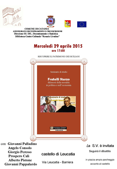 Mercoledì 29 aprile 2015 alle ore 17.00, la Biblioteca Centro Culturale "Rosario Livatino", per riscoprire il patrimonio dei Siciliani, terrà il Seminario di studio Fratelli Sturzo: difensori della moralità in politica e nell'economia.