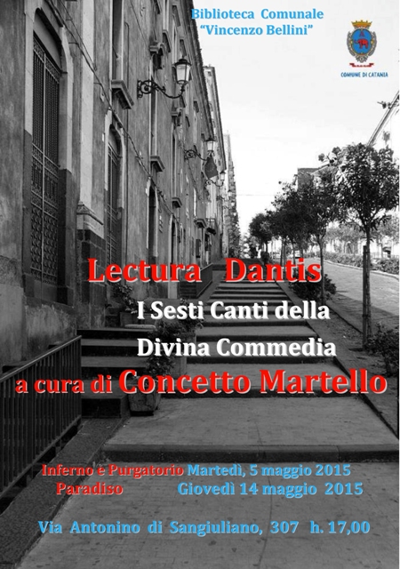 Per il Maggio dei Libri alla Biblioteca Bellini di via Sangiuliano, 307 alle ore 17.00 I sesti canti della Divina Commedia, Lectura Dantis a cura di Concetto Martello. Leggi il programma di tutti gli eventi alla sezione del sito Maggio dei Libri