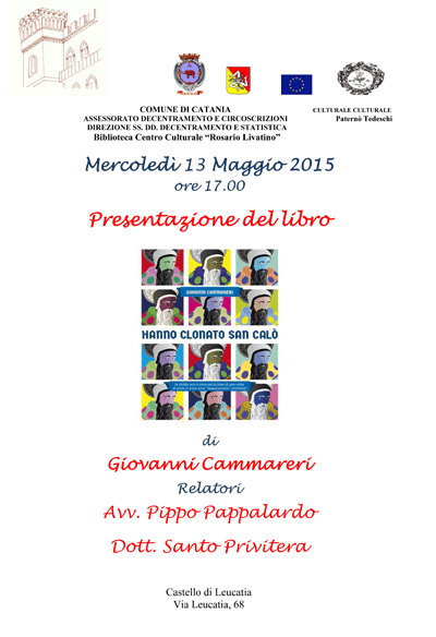 Mercoledì 13 Maggio alle ore 17.00, La Biblioteca C. C "R. Livatino" , in collaborazione con il Centro culturale V. Paternò Tedeschi, propone la presentazione del libro "Hanno clonato San Calò" di Giovanni Cammareri.