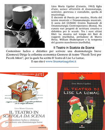 In seno a questa manifestazione verrà presentato il libro "Il Teatro in scatola da Scena", manuale per giovani artisti, della prof.ssa Lina Maria Ugolini, insegnante di Drammaturgia e Storia della Musica presso L'Istituto Musicale Vincenzo Bellini di Catania.