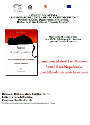 Mercoledì 24 Giugno 2015 alle ore 17.30, la Biblioteca C.C. "R. Livatino" propone il quarto incontro della Rassegna letteraria -Racconti di parallele quotidianità, brevi storie dall'equidistante mondo dei sentimenti, ed. Akkuaria.