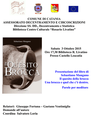 Sabato 3 Ottobre 2015 alle ore 17.30 la Biblioteca Centro Culturale "R. Livatino" propone la presentazione del libro "Il quesito della brocca" di Sebastiano Mangano.