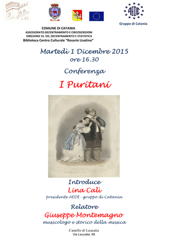 Martedì 1 Dicembre 2015 alle ore 16.30, la Biblioteca Centro Culturale "R. Livatino", in collaborazione con l'associazione AEDE di Catania, propone una conferenza sull'opera "I Puritani", che verrà rappresentata al Teatro Bellini nel mese di Dicembre.