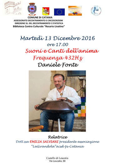 Martedì 13 dicembre 2016 alle ore 17.00, la Biblioteca Centro Culturale "R. Livatino" propone la conferenza Suoni e Canti dell'anima Frequenza 432Hz.