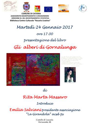 Martedì 24 Gennaio 2017 alle ore 17.00, la Biblioteca Centro Culturale "R. Livatino" propone la presentazione del libro d'arte Gli alberi di Gornalunga di Rita Marta Massaro.