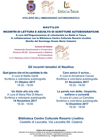 La Biblioteca Centro Culturale "R. Livatino" propone, in collaborazione con l'associazione di volontariato Le Stelle in Tasca, il progetto Nautilus, incontri di lettura e ascolto di scritture autobiografiche.
