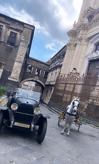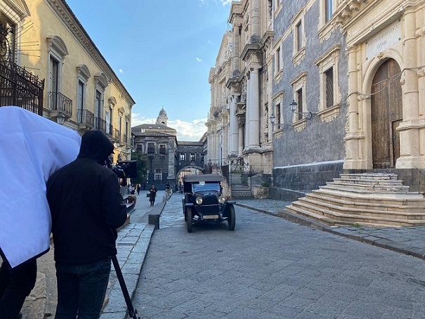 E così la via Crociferi per un giorno è tornata indietro nel tempo, frequentata da donne e uomini agghindati in abiti novecenteschi, attraversata da carrozze e cavalli e qualche auto d'epoca. Il set è stato allestito anche all'incrocio con via Antonino di Sangiuliano, il campo base per i mezzi tecnici in piazza Dante, in prossimità del monastero dei Benedettini.